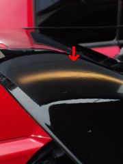 ヘコミはボンネットの先端でかなり左端の方です、大きさは4センチ位はあります、酷いスジや鋭い打撃痕がないのが救いですが、ボディ色が黒系なので少しの歪みが残っても見え易い色なので正直なところとてもやりづらいです(^_^;)、しかも先端なのでヘコミの裏側はフレームの中に隠れています、こういう場合はフレームに空いている『穴』からツールを入れるケースが多いのですが、その『穴』の位置やフレームの内部構造によっては、『穴』をツールの支点にしないといけない場合があり、その場合は『穴』がよれて変形してしまいます、インシュレーター(ボンネットの裏側についているカバーみたいなもの)で隠れる位置ならまだ良いのですが、残念ながら先端の裏側はインシュレーターでは隠れないので変形させてしまうとボンネットを開けると見えてしまいます、できれば何とかそれ以外でツールアクセスを確保したいのですが・・・あれこれ考えた挙句、ボンネットキャッチからツールを入れてみます、かなり苦しいですが何とかギリギリ届きます、できる限りここから作業してどうしても触れない部分が出てきたら、最悪『穴』を使う事に致しました、使えるツールも限られてしまいますのでかなり苦労致しましたが何とか『穴』を使わずにリペアできました。