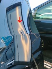 ヘコミはリアゲートの端でプレスライン上です・・・かなりの損傷です、大きさは約10センチぐらいですがラインを鋭角に潰しています、しかも、ボディ色は最も歪みが見え易い黒系!こういう状況だと必ず何かしらの違和感が残る可能性が高く、完全に修復するのは正直なところ難しいです、ゴメンナサイして帰ろうかと思いましたが(笑)、担当者様から『とにかく今より目立たなくなればOKだから・・・』とご配慮たっぷりのお言葉をいただけましたので気を取り直して作業開始です、唯一の救いはツールアクセスが良好な事です、もしこれで適したツールが使えないと目立たなくする事すら正直なところ厳しいです、とにかく丁寧にヘコミに掛っている応力を抜いて鋼板が素直に動くようにしていきます、特にプレスラインと直交しているスジ状の打撃痕がキモ?です、できる限りスジを開いてからツールで触っていきます、ただ、これ程クッキリとスジになってラインを潰してしまっているとなかなかこちらのイメージ通りには変化してくれません(^_^;)、照りつけるキビシイ日差しの中で悪戦苦闘する事、約1時間半!