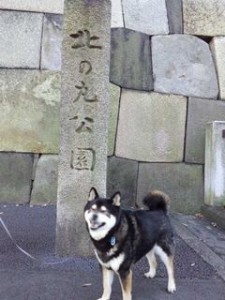 小太郎(黒柴)とくま吉(黒ポメ)も武道館の前で無理やり記念撮影!(くま吉ピンボケ)